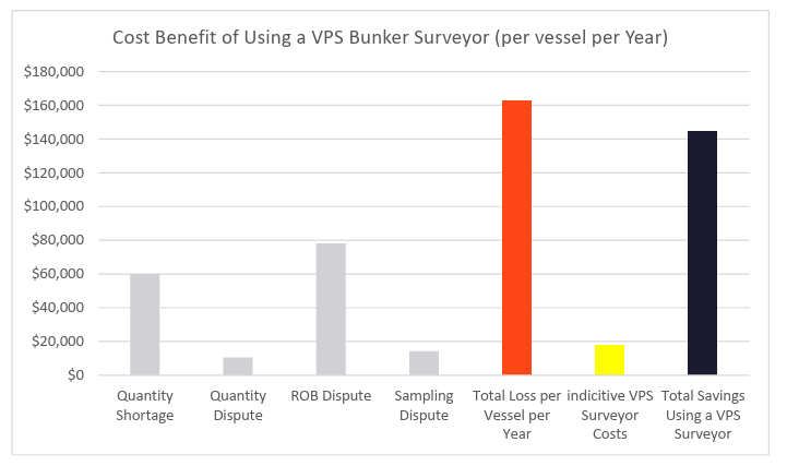Overall, VPS data has shown that bunkering activity needs to be methodically controlled with the constant presence of a knowledgeable & professional VPS Bunker Surveyor to avoid a quantity shortage situation. Failure to do this will result in a potential total bunker quantity loss in the order of over $160,000 per vessel per year. VPS is able to generate these savings through our high‐quality surveying service, underpinned by a detailed BQS Code of Practice and a rigorous training and refresher programme for all Surveyors. The engagement of a VPS Bunker Surveyor at approximately 10% of this cost will not only save money, but significantly reduce management stress, time & reputation.